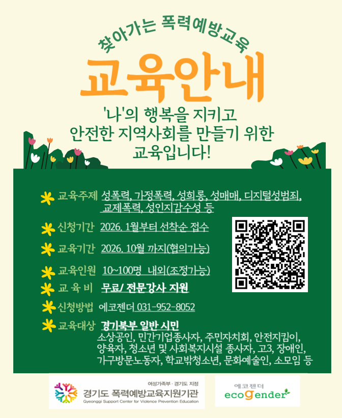 공지사항2026년 경기북부 찾아가는 폭력예방교육 신청안내2025년 경기북부 찾아가는 폭력예방교육 신청 안내 사랑의 김장나눔2024 찾아가는 폭력예방교육 마감 안내2024 경기북부청소년성문화센터 인형극 공연 사업 진행